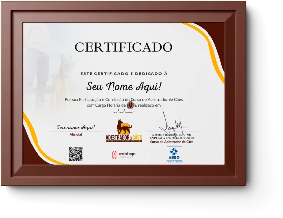 Você terá acesso ao seu certificado de 60 horas —disponível diretamente na sua área do aluno, pronto para fortalecer seu currículo, gerar mais credibilidade e abrir novas oportunidades na sua carreira como Adestrador de Cães.