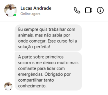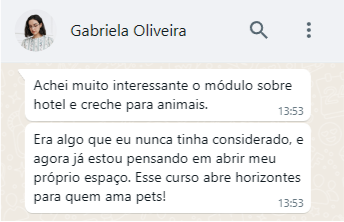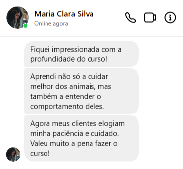 Além das aulas teóricas, o curso inclui práticas reais e suporte contínuo, garantindo que você esteja preparado em cada etapa. Prepare-se para desenvolver habilidades excepcionais, conquistar a confiança dos tutores e se destacar como um profissional altamente capacitado no cuidado e bem-estar dos pets.